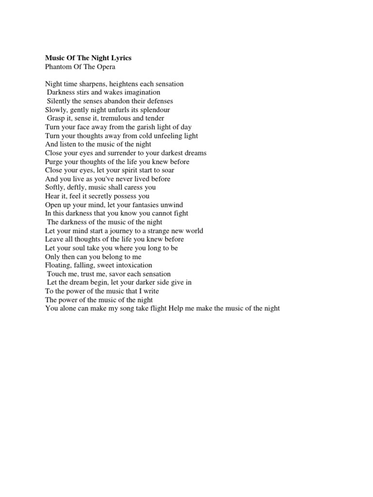 The Music of the Night Lyrics. Night time sharpens heightens each sensation Darkness stirs and wakes imagination Silently the senses abandon their defenses Slowly gently night unfurls its splendor Grasp it sense it tremulous and tender Turn your face away from the garish light of day Turn your thoughts away from cold unfeeling light And listen to the music of the night Close your eyes and surrender to. Music of the Night Lyrics.